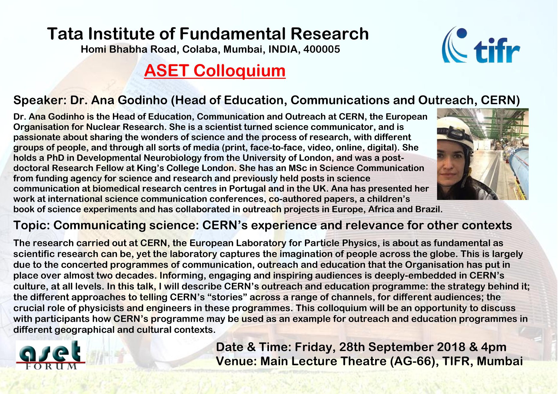 The research carried out at CERN, the European Laboratory for Particle Physics, is about as fundamental as scientific research can be, yet the laboratory captures the imagination of people across the globe. This is largely due to the concerted programmes of communication, outreach and education that the Organisation has put in place over almost two decades. Informing, engaging and inspiring audiences is deeply-embedded in CERN’s culture, at all levels. In this talk, I will describe CERN’s outreach and education programme: the strategy behind it; the different approaches to telling CERN’s “stories” across a range of channels, for different audiences; the crucial role of physicists and engineers in these programmes. This colloquium will be an opportunity to discuss with participants how CERN’s programme may be used as an example for outreach and education programmes in different geographical and cultural contexts.